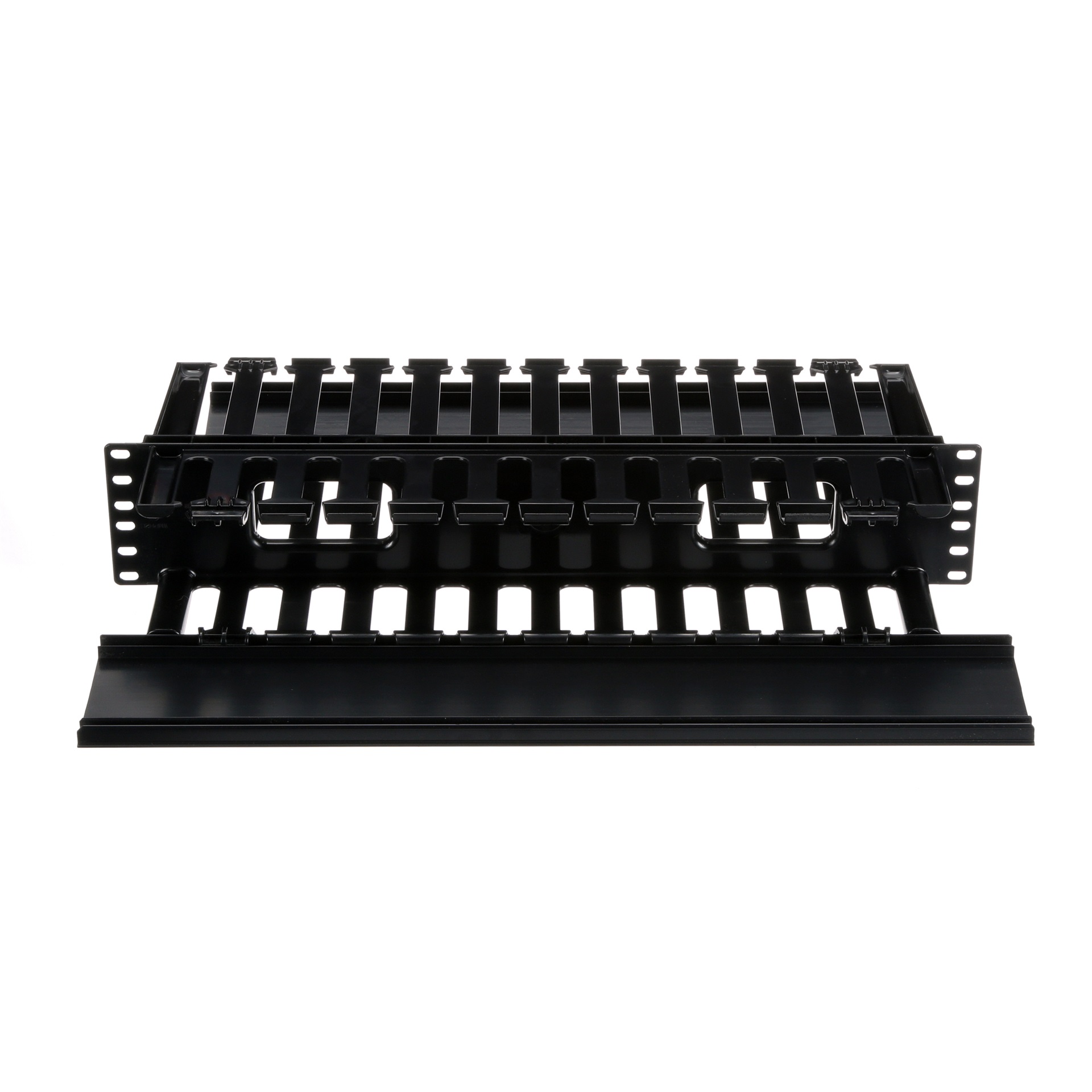 The PatchLink™ Horizontal Cable Manager provides a neat and efficient way to manage patch cables on any standard EIA 19 inch (483mm) rack or cabinet. It manages copper, fiber optic, and coax cables. Flexible fingers organize patch cords, simplifying moves, adds, and changes while the “closed” design protects the patch cables in the pathway. The dual-sided cable manager is 2 RU, includes dual-hinging front and rear covers, and bend radius clips. The manager is black.