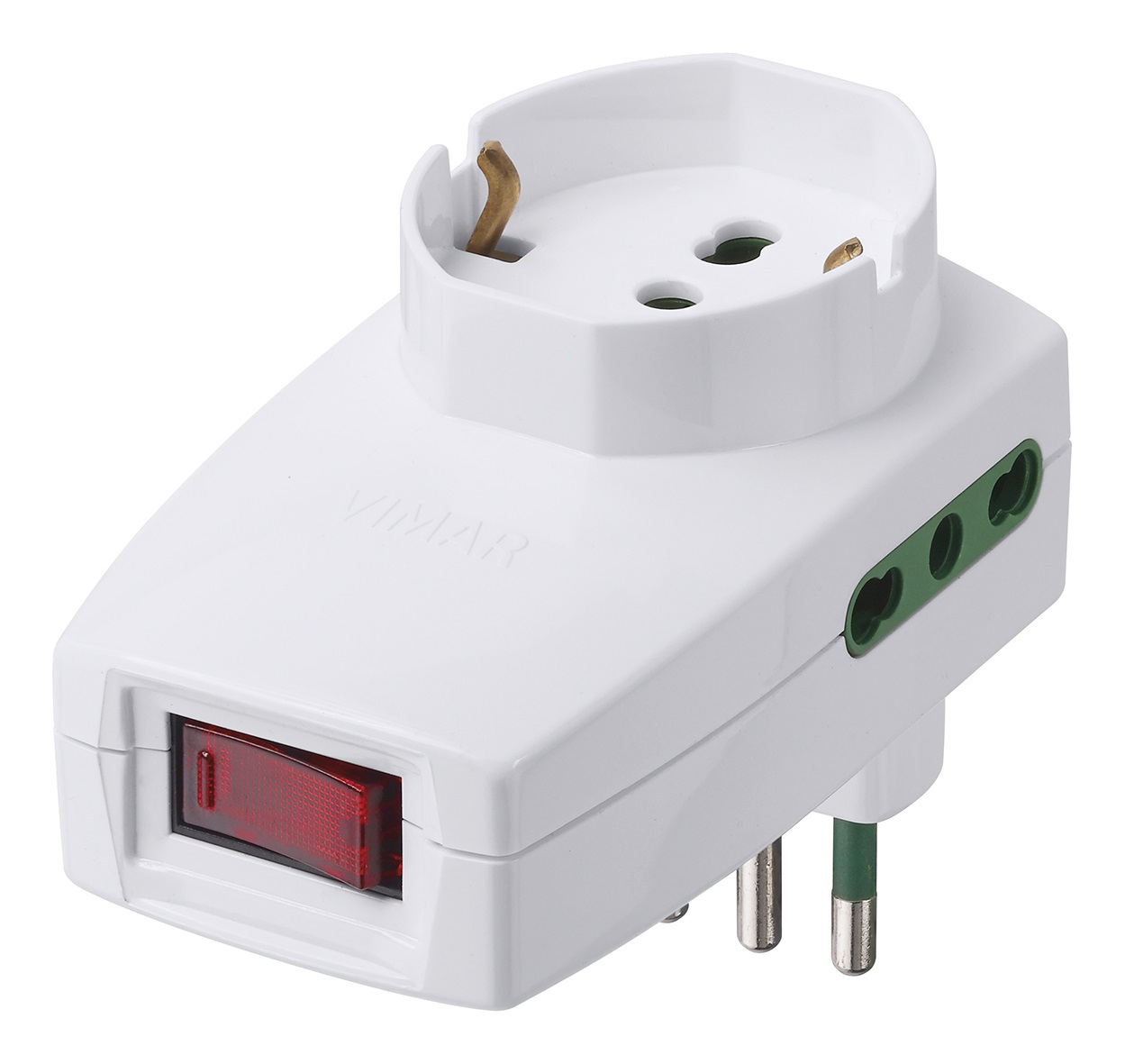 Adattatore multiplo SICURY 250 V~ sfalsato verticale, spina 2P+T 10 A standard italiano tipo S11, due Bpresa 2P+T 16 A standard italiano tipo P17/11, una presa 2P+T 16 A universale standard italiano tipo P40, interruttore automatico di protezione 10 A, potenza massima prelevabile 2500 W, bianco
