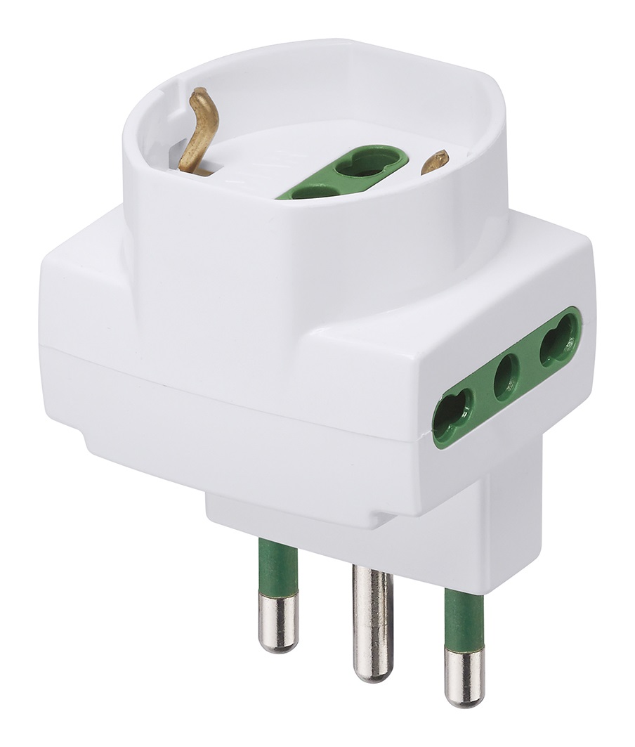 Adattatore multiplo SICURY 250 V~ sfalsato verticale - max 1500 W, spina 2P+T 16 A standard italiano tipo S17, due Bpresa 2P+T 16 A standard italiano tipo P17/11, una presa 2P+T 16 A universale standard italiano tipo P40, bianco