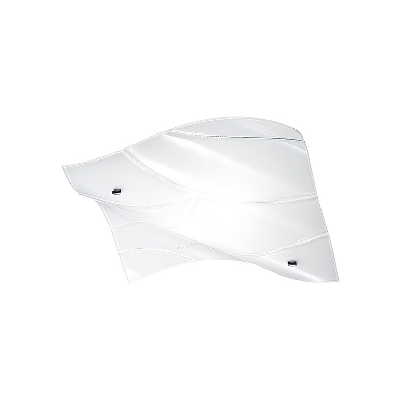 Lampada a soffitto con attacco E27 dal design moderno che richiama le morbide forme di una foglia. Diffusore in vetro fusione extrachiaro con venature in rilievo. Montatura e rosone in metallo cromato .