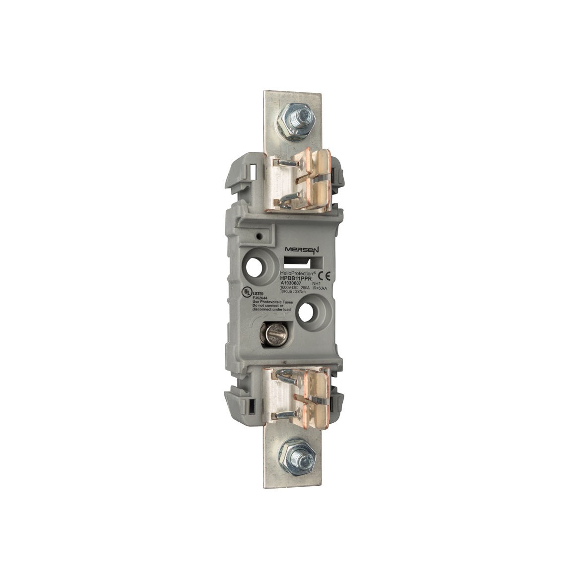 NH GPV fuse-bases are available in 1000Vdc and 1500Vdc in sizes NH1, NH2 NH1XL and NH2XL-3L. Single phase type. Screw connection. Open designs and with touch safe protection for fuse links with plein blade contacts. Materials according RoHS, and following IEC and UL standards