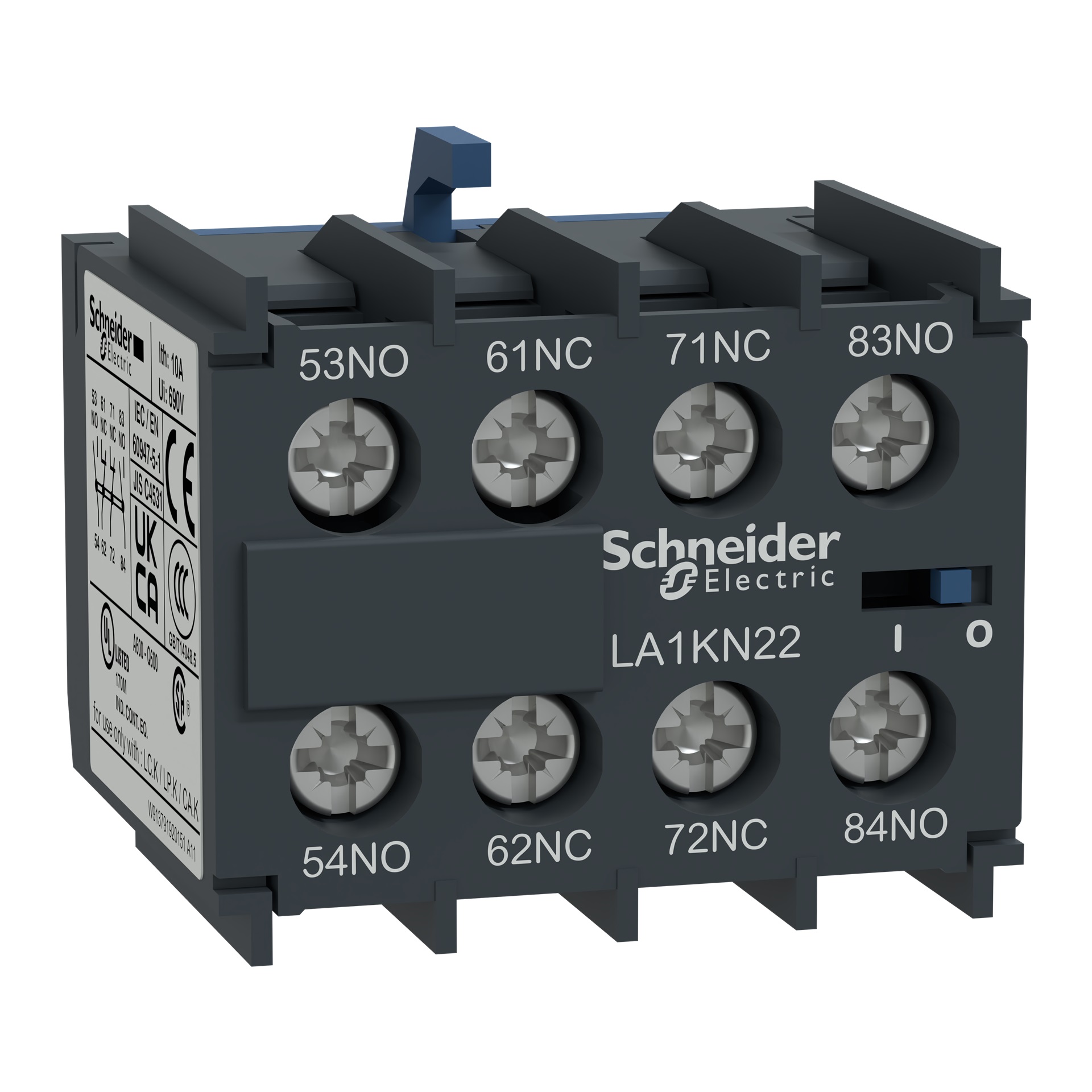 LA1KN04 è un blocco di contatti ausiliari istantanei di Schneider Electric per contattori TeSys K (tranne LP4K e LP5K). E' composto da contatti 4NC fino a 10A 690V CA e collegamento mediante morsetti a vite. Facile da agganciare sulla parte anteriore, garantisce affidabilità e resistenza elevate. Disponibile in tutto il mondo, è certificato secondo più standard (IEC, UL, CSA, CCC).