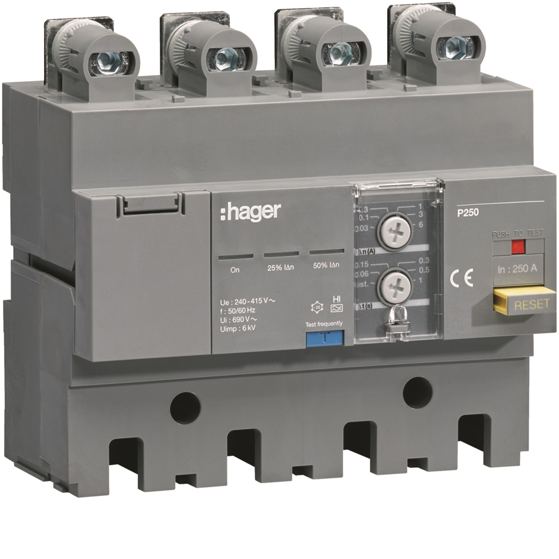Blocco differenziale per interruttori scatolati h3+ serie P250 da 4 poli, In 250 A, installabile inferiormente tramite accoppiamento di sicurezza. Tipo A-HI, con immunità rinforzata contro guasti a componente pulsante unidirezionale. Sensibilità e tempo d’intervento regolabili, test manuale, segnalazione LED/remota e morsetti per cavi in rame. Conforme a CEI EN 60947-2.