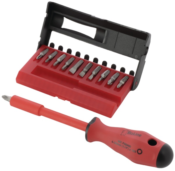 Cacciavite porta-inserti, isolato 1.000 V, con 11 inserti. Porta-inserti magnetico 1/4'', esagonale. Prodotto consegnato con un cofanetto composto da 4 inserti a punta piatta, 3 inserti a punta PH, 2 inserti a punta PZ, 2 inserti a punta Torx®. Manico ergonomico.