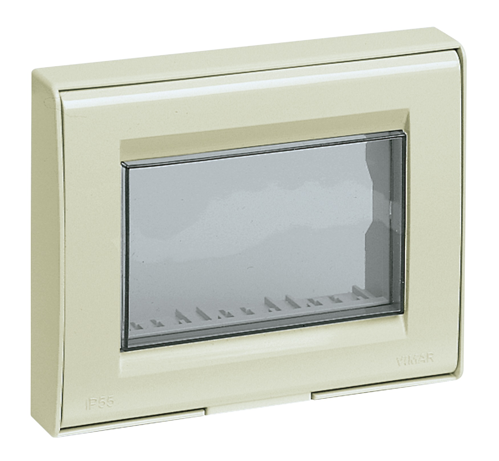 Calotta IP55 per appaecchi 3 moduli Idea o 3 moduli speciali 8000, avorio RAL 9001. Fornita con 3 adattatori 08491 per installazione di moduli standard 8000. Grado di protezione IP55 a coperchio chiuso, con scatola 13731.S o scatola da incasso unificata 3 moduli in presenza di pareti lisce senza scanalature e impermeabili e IPX0 a coperchio aperto
