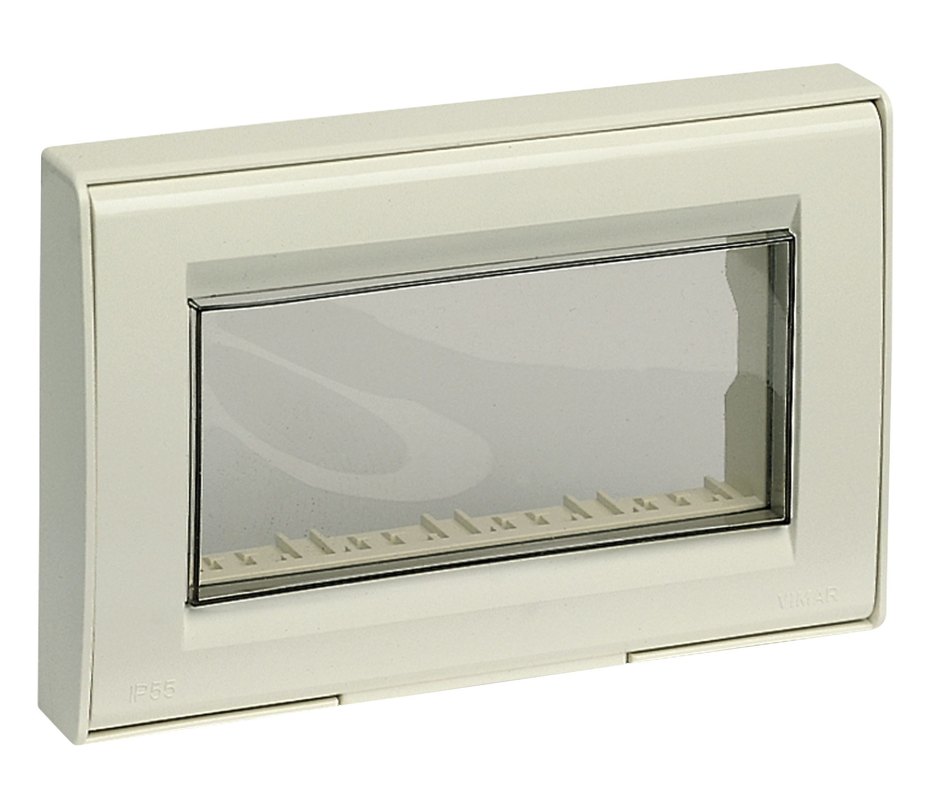 Calotta IP55 per apparecchi 4 moduli Idea o 4 moduli speciali 8000, avorio RAL 9001. Fornita con 4 adattatori 08491 per installazione di moduli standard 8000. Grado di protezione IP55 a coperchio chiuso, con scatola unificata da incasso 4 moduli in presenza di pareti lisce senza scanalature e impermeabili e IPX0 a coperchio aperto