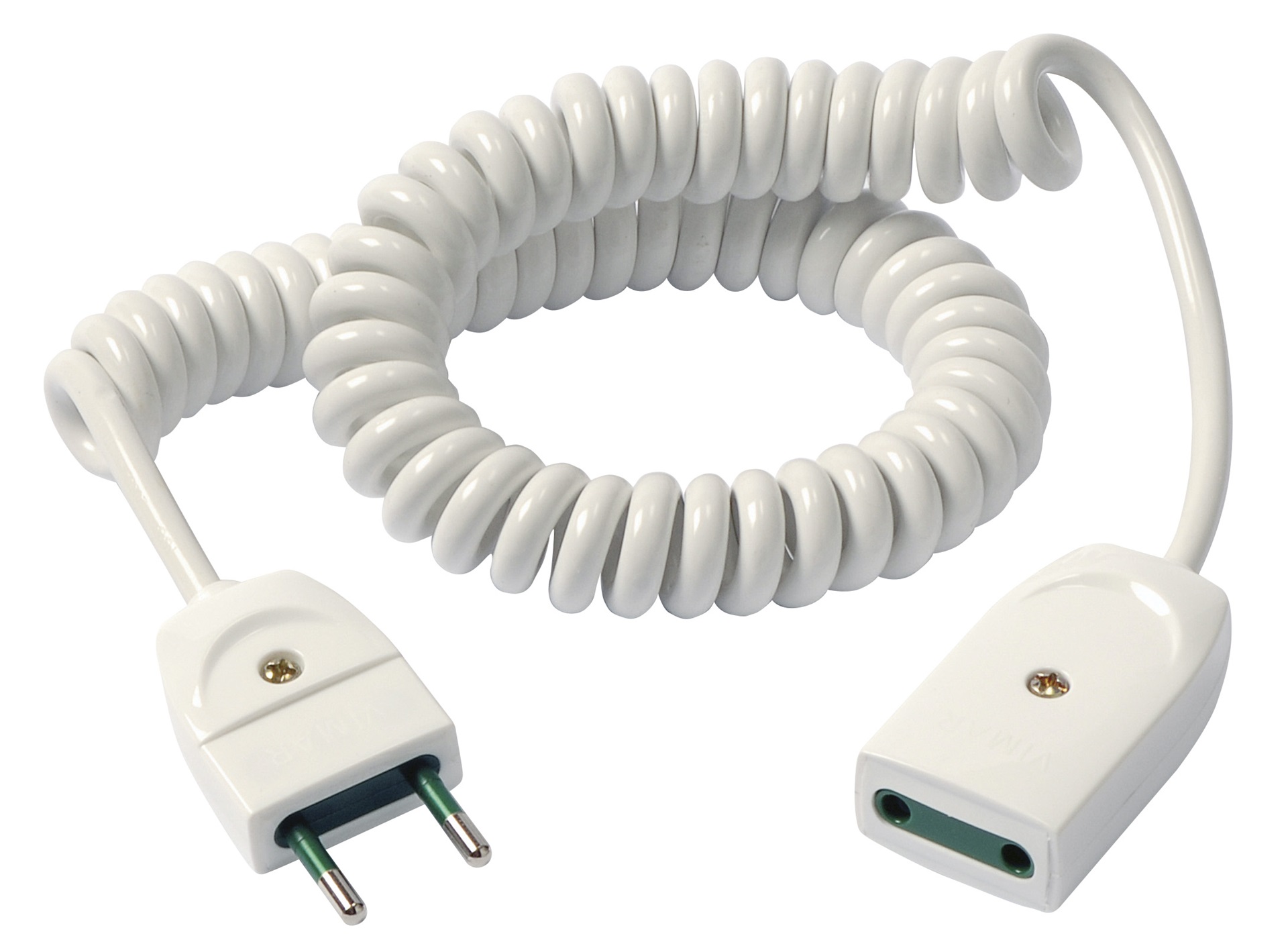 Cordone prolungatore estensibile 3 metri, cavo 2x0,75 mm2 H05VVH8-F, spina 2P 10 A 250 V~ standard italiano tipo S10, presa SICURY 2P 10 A 250 V~ standard italiano tipo P10, potenza massima prelevabile 1300 W, bianco. Adatto all'alimentazione di apparecchi di classe II