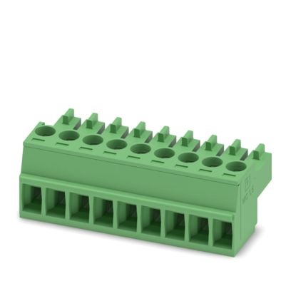 Connettore per circuiti stampati, sezione nominale: 1,5 mm², colore: verde, corrente nominale: 8 A, tensione di dimensionamento (III/2): 160 V, superficie contatti: Sn, tipo di connessione del contatto: Femmina, numero dei potenziali: 9, numero di file: 1, numero poli: 9, numero di connessioni: 9, serie di prodotti: MC 1,5/..-ST, passo: 3,5 mm, tipo di connessione: Connessione a vite con gabbia, forma di attacco delle viti: L Fessura longitudinale, direzione di collegamento conduttore/scheda: 0 °, sistema di spine: COMBICON MC 1,5, bloccaggio: assente, tipo di fissaggio: assente, tipo di confezione: confezionato nel cartone