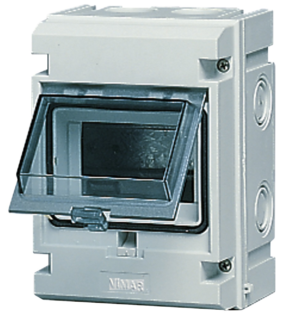 Centralino da parete IP55, con portello trasparente a cerniera orizzontale, 5 (4+1) moduli, grigio RAL 7035. Fornito con tappi per il doppio isolamento. Predisposto per 2 portamorsettiere V51853. Componibile tramite accessorio di giunzione V51905