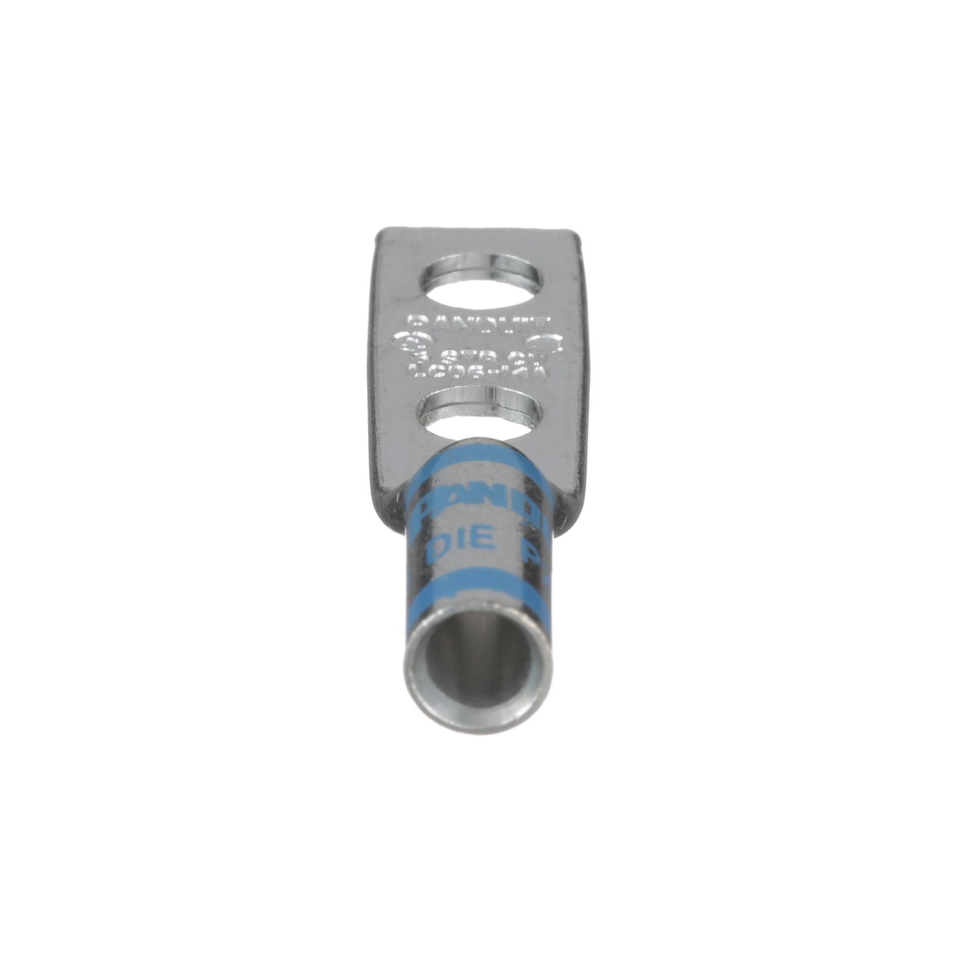 The LCD6-14A-L Tin-Plated Copper Compression Connector Lug, two-hole, standard barrel, has color-coded barrels marked with Panduit and specified competitor die index numbers for proper crimp die selection. An inspection window aids to visually assure full conductor insertion, and the tin-plate material helps to inhibit corrosion. UL Listed and CSA Certified.