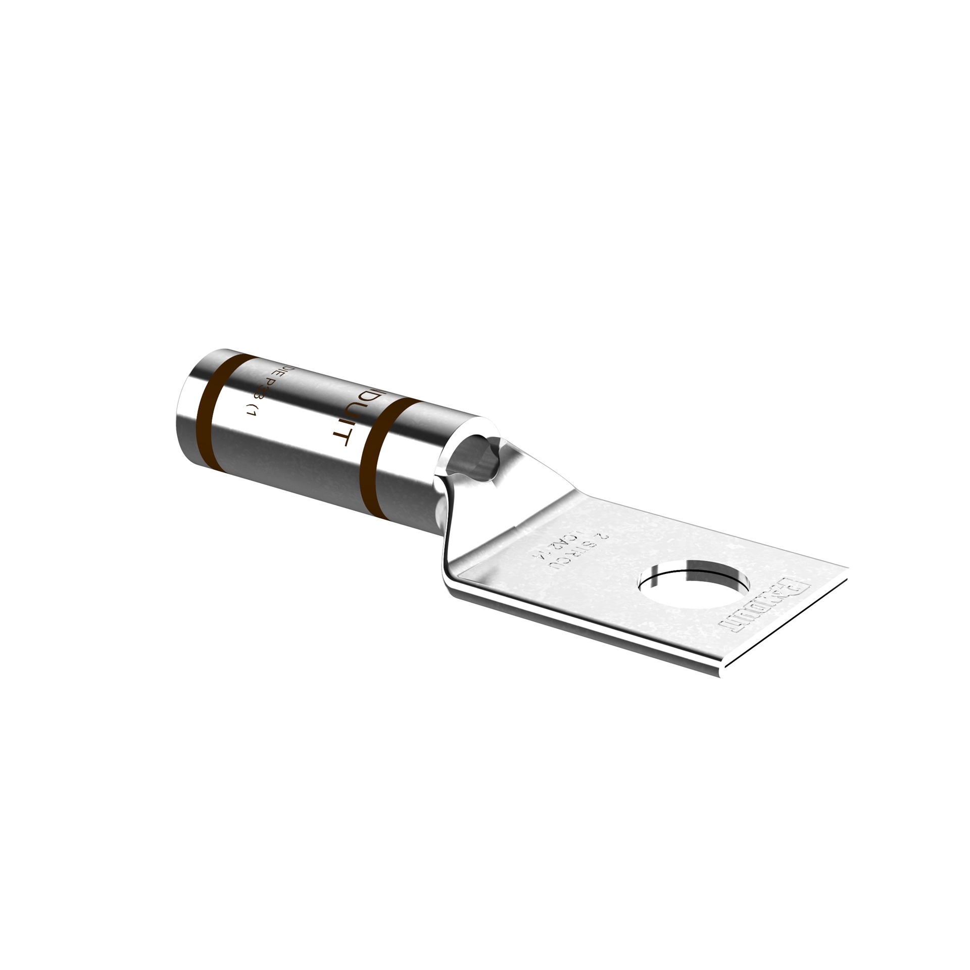 The LCA2-14-Q Tin-Plated Copper Compression Lug, one-hole, standard barrel, has color-coded barrels marked with Panduit and specified competitor die index numbers for proper crimp die selection. An inspection window aids to visually assure full conductor insertion, and the tin-plate material helps to inhibit corrosion. UL Listed and CSA Certified to 35 KV and temperature rated to 90°C