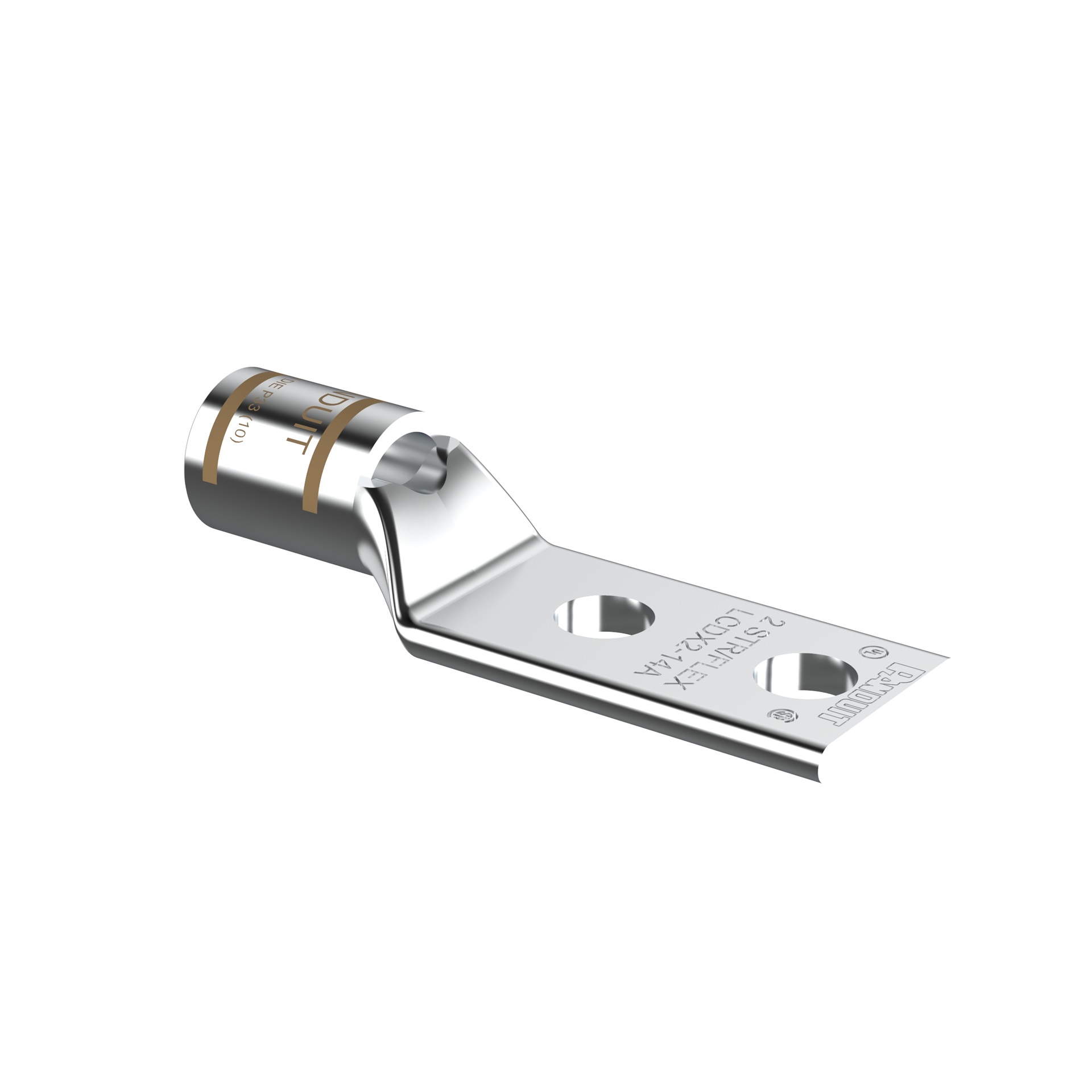 The LCDX2-14A-E Tin-Plated Copper Compression Connector Lug, two-hole, standard barrel, has color-coded barrels marked with Panduit and specified competitor die index numbers for proper crimp die selection. The generously beveled wire entry prevents bent back strands when inserting the conductor into the barrel. An inspection window aids to visually assure full conductor insertion, and the tin-plate material helps to inhibit corrosion. UL Listed and CSA Certified.
