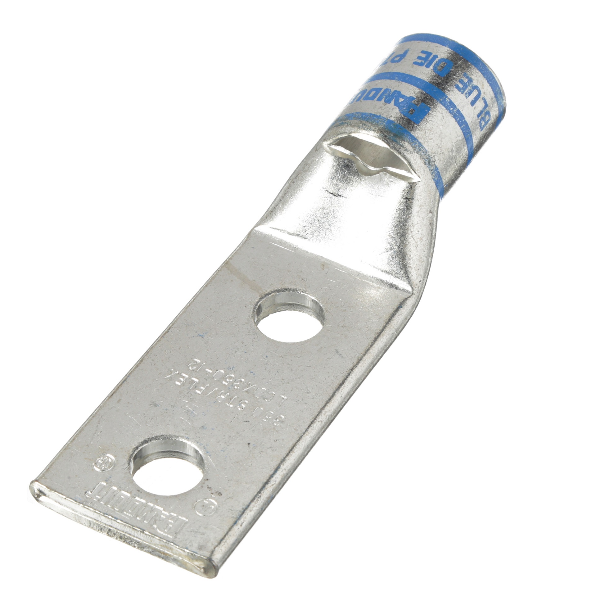 The LCDX350-12-6 Tin-Plated Copper Compression Lug, two-hole, standard barrel, has color-coded barrels marked with Panduit and specified competitor die index numbers for proper crimp die selection. An inspection window aids to visually assure full conductor insertion, and the tin-plate material helps to inhibit corrosion. UL Listed and CSA Certified to 35 KV and temperature rated to 90°C.