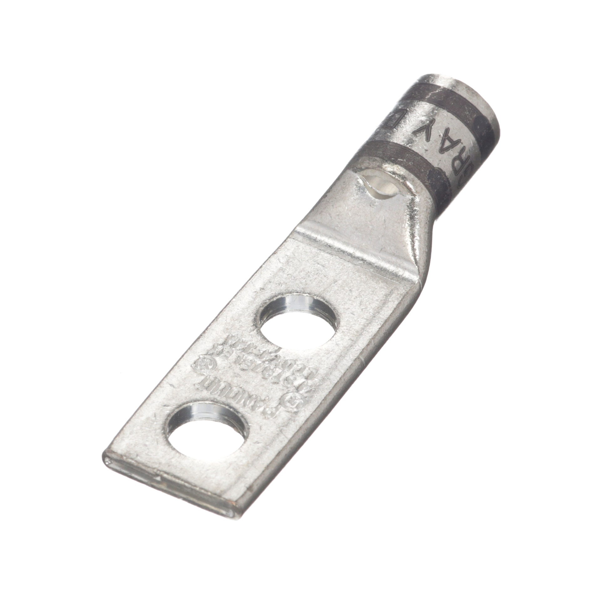 The LCDX4-14A-L Tin-Plated Copper Compression Connector Lug, two-hole, standard barrel, has color-coded barrels marked with Panduit and specified competitor die index numbers for proper crimp die selection. The generously beveled wire entry prevents bent back strands when inserting the conductor into the barrel. An inspection window aids to visually assure full conductor insertion, and the tin-plate material helps to inhibit corrosion. UL Listed and CSA Certified.