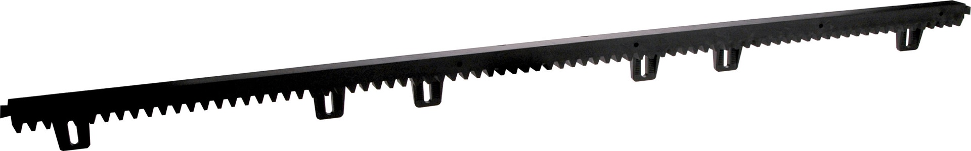 Cremagliera modulo 4 in nylon PA6 e fibra di vetro con anima in acciaio 10 x 10 mm per cancelli scorrevoi fino a 600 kg, completa di supporto per il fissaggio.