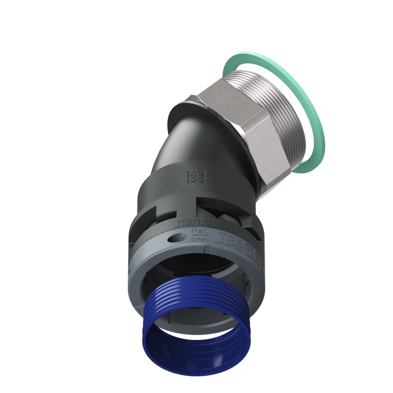 La curva a 45° con filetto in metallo girevole facilita in modo strutturale il montaggio di cablaggi preassemblati. La particolare costruzione senza spigoli interni permette un facile inserimento dei cavi annullando la possibilità che gli stessi vengano danneggiati. Le parti girevoli del raccordo riducono i movimenti torsionali delle guaine aumentando la durata nel tempo delle connessioni sottoposte a movimenti. Inoltre il filetto metallico assicura una più alta resistenza alla trazione e la possibilità di essere saldamente ancorato con un comune frena filetti. Soddisfa i requisiti standard nelle applicazioni tecniche ad elevate prestazioni nell’industria pesante e nel settore ferroviario IP68/IP69K.