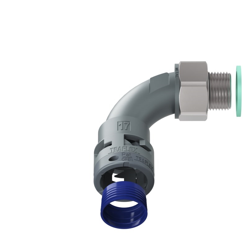 La curva a 90° filetto in metallo girevole facilita in modo strutturale il montaggio di cablaggi preassemblati. La particolare costruzione senza spigoli interni permette un facile inserimento dei cavi annullando la possibilità che gli stessi vengano danneggiati. Le parti girevoli del raccordo riducono i movimenti torsionali delle guaine aumentando la durata nel tempo delle connessioni sottoposte a movimenti. Inoltre il filetto metallico assicura una più alta resistenza alla trazione e la possibilità di essere saldamente ancorato con un comune frena filetti. Soddisfa i requisiti standard nelle applicazioni tecniche ad elevate prestazioni nell'industria pesante e nel settore ferroviario IP68/IP69K.