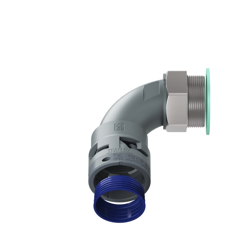 La curva a 90° filetto in metallo girevole facilita in modo strutturale il montaggio di cablaggi preassemblati. La particolare costruzione senza spigoli interni permette un facile inserimento dei cavi annullando la possibilità che gli stessi vengano danneggiati. Le parti girevoli del raccordo riducono i movimenti torsionali delle guaine aumentando la durata nel tempo delle connessioni sottoposte a movimenti. Inoltre il filetto metallico assicura una più alta resistenza alla trazione e la possibilità di essere saldamente ancorato con un comune frena filetti. Soddisfa i requisiti standard nelle applicazioni tecniche ad elevate prestazioni nell'industria pesante e nel settore ferroviario IP68/IP69K.