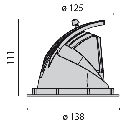 Proiettore LED da incasso per interni, composto da: Corpo del faretto e anello in alluminio pressofuso, verniciato a polveri / Riflettore orientabile orizzontalmente verso l‘interno e l‘esterno grazie al particolare meccanismo cardanico / Orientabile a 60° (-15 a 45°), rotazione su 355° / Riflettore in alluminio purissimo con sfaccettature sferiche ad alta brillantezza per il massimo rendimento della lampada ed una resa cromatica neutra / Riflettore in versione flood / Tolleranza cromatica (MacAdam) = 3 SDCM / Il montaggio a soffitto non richiede l\'uso di utensili / Completo di alimentatore elettronico / Fissaggio a soffitto mediante molle / Completo di vetro di protezione