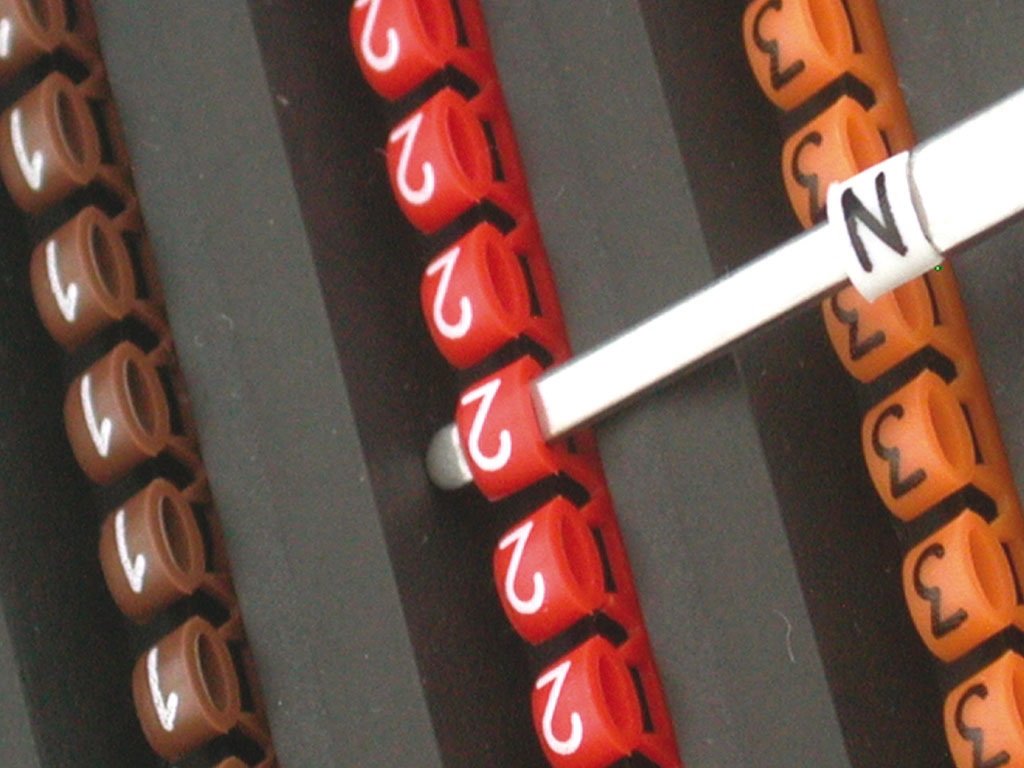 L’utilizzo degli elementi di siglatura PMP-30 é estremamente semplice: la sigla si compone con gli appositi utensili e si introduce direttamente nella finestra dei tubetti PM. Una volta introdotti, gli elementi rimangono protetti dal tubetto che li rende inattaccabili da acqua, alcool, sostanze acide, alcaline e da numerosi solventi. La finestra di inserimento permette di introdurre gli elementi anche in tubetti già montati su cavi cablati; al tempo stesso é possibile effettuare correzioni senza intervenire sul cablaggio. Gli elementi di siglatura sono disponibili nei colori bianco e giallo, con stampa delle sigle in nero, e colorati, secondo il codice internazionale previsto dalla norma IEC 757. In questo caso la stampa delle sigle può essere bianca o nera, come evidenziato di seguito.