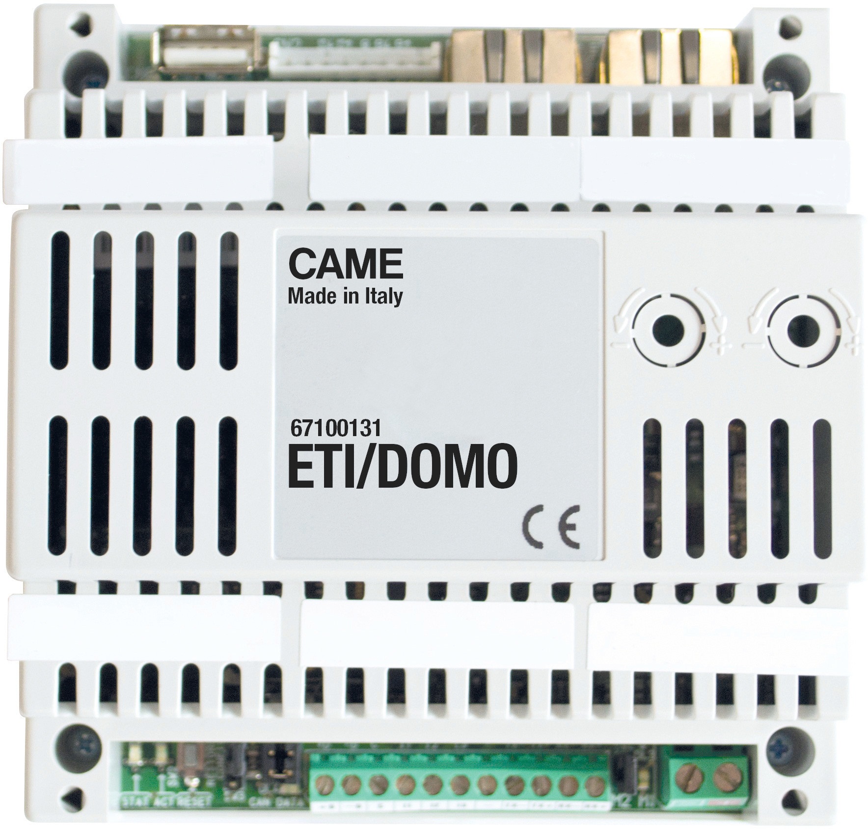 Permette il controllo dei moduli domotici previsti nell’impianto. Collega il sistema ad una rete LAN alla quale possono essere collegati i terminali touch screen. Svolge la funzione di master d’impianto per il controllo del sistema tramite dispositivi portatili muniti di apposita App CAME DOMOTIC. È predisposto per connettere al Cloud il sistema, al fine di effettuare il controllo remoto delle apparecchiature installate. Il contenitore permette l’installazione da quadro su guida DIN.