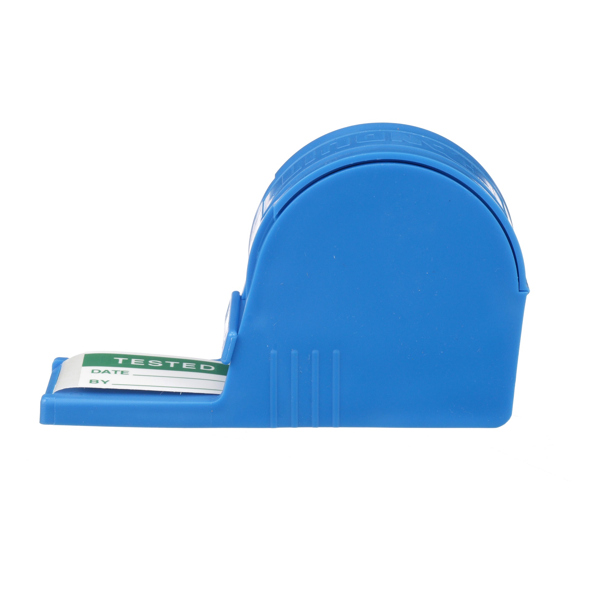 Write-on quality label in dispenser, 1.5" W x 1.0" H, 'Tested, by, date' (legend), polyester, green/white, 200 labels per dispenser.