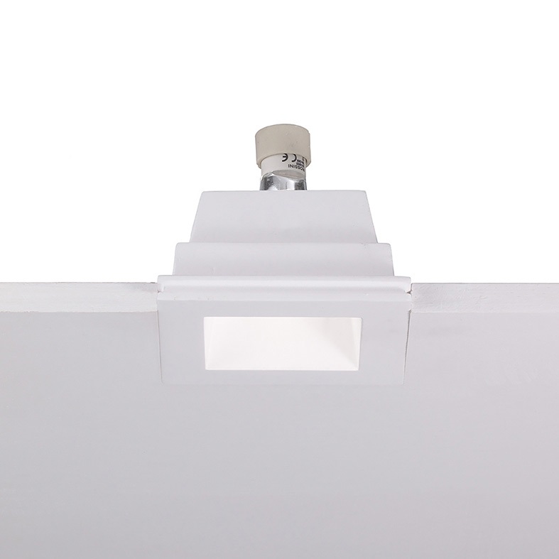 Faretto ad incasso in gesso rasato a scomparsa totale con attacco GU10 che consente di montare lampadina LED. Struttura quadrata, singola o doppia. La versione singola ? disponibile anche con luce laterale fissa inclinata di 45?. Per la versione 9831 cassaforma per installazione in muratura da ordin are come accessorio.