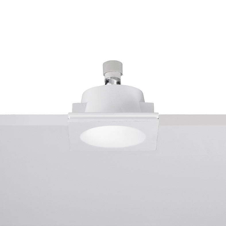 Faretto ad incasso in gesso rasato a scomparsa totale. Disponibile in versione tonda e quadrata, con fonte luminosa arretrata, con attacco GU10 che consente di montare lampadina LED. Cassaforma per installazione in muratura da ordinare come accessori o.