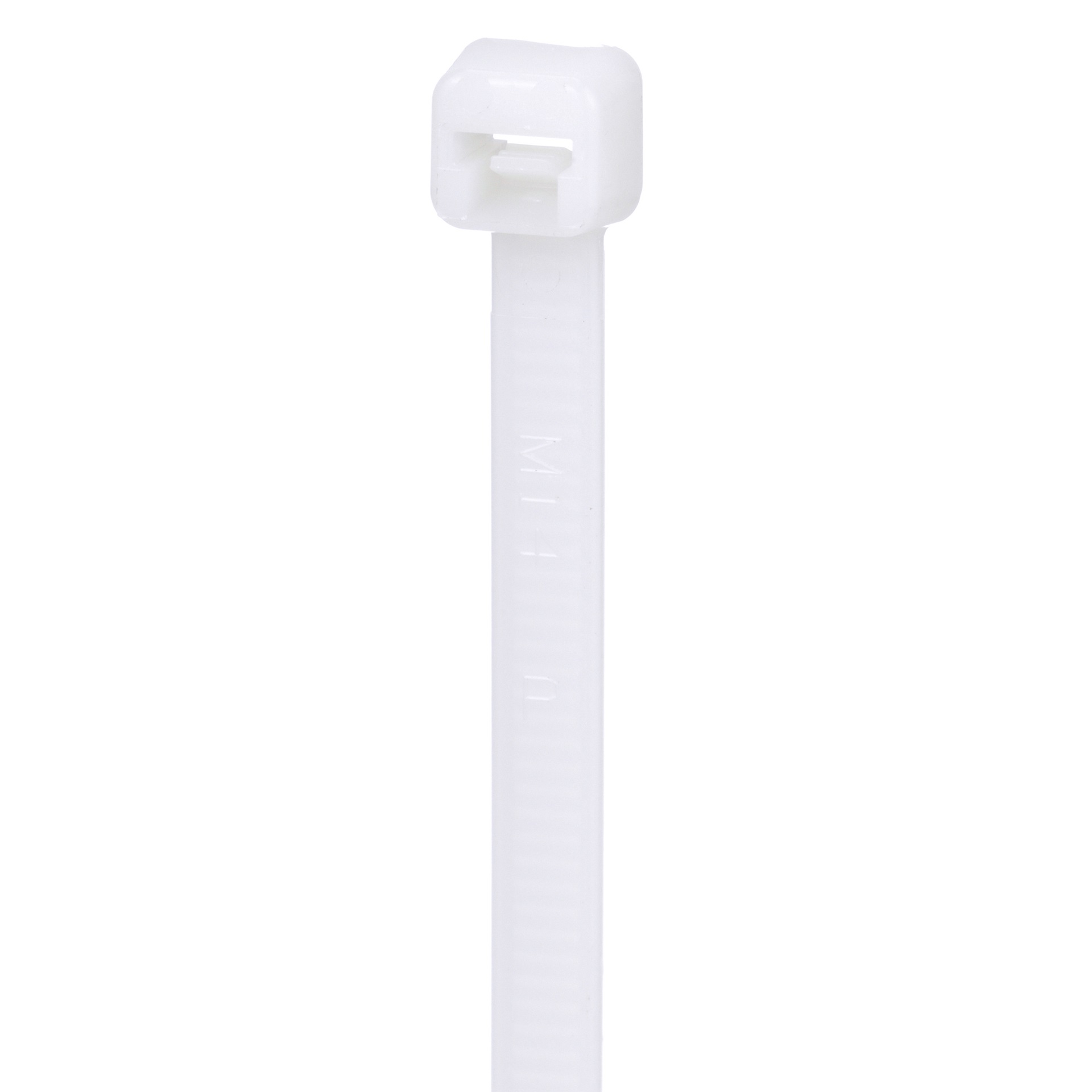 Cable Tie, 4.8 Inches (122 mm) Length, Standard, 50 Pounds Minimum Loop Tensile Strength, Nylon 6.6, Natural. Material Flammability Rating of V-2. For indoor use. One-piece construction for consistent performance and reliability. Low thread force. Curved tip is easy to pick up from flat surfaces and allows faster initial threading.