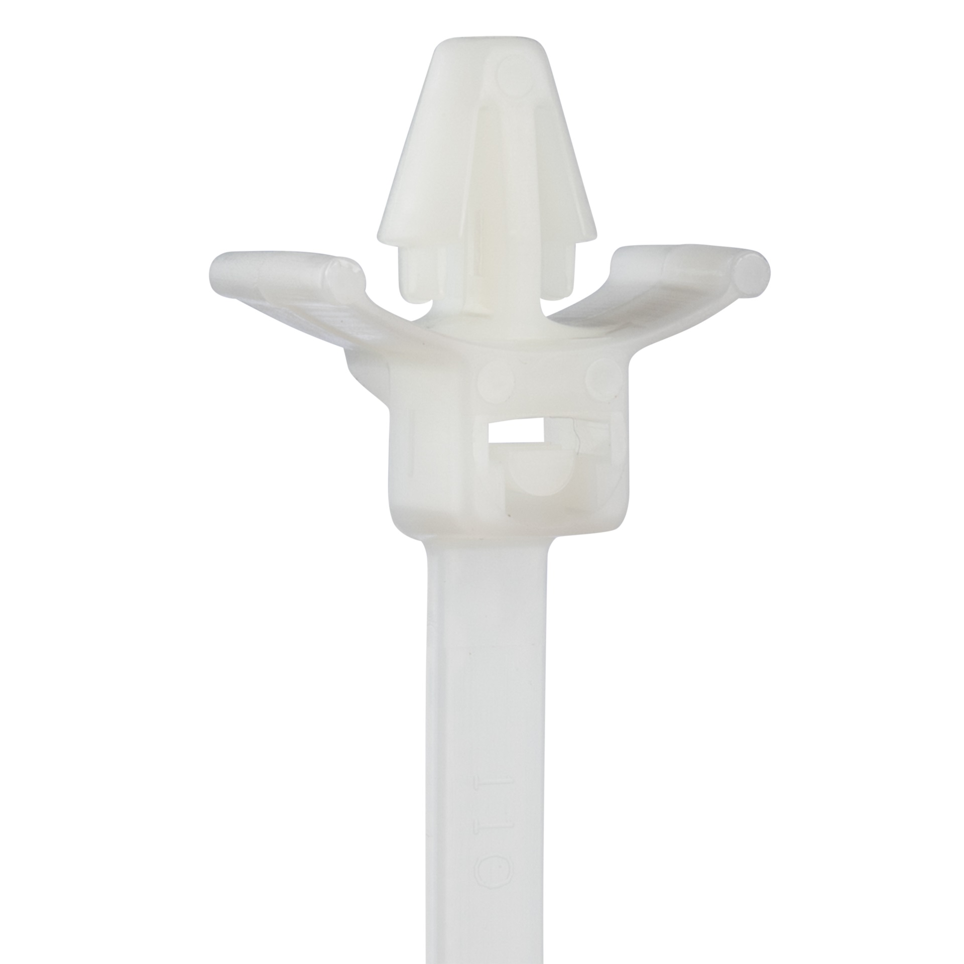 Wing Push Mount Tie, 4.3 Inches (109 mm) Length, Miniature, Nylon, Natural. For indoor use. Cable tie, mount and fastener in a single part. Used to attach bundles to another surface such as a flat panel. Anchor is easily pressed into a pre-formed hole and locks in place. Wings provide constant tension for a stable, secure and rattle-free installation. Curved tip is easy to pick up from flat surfaces and allows faster initial threading.