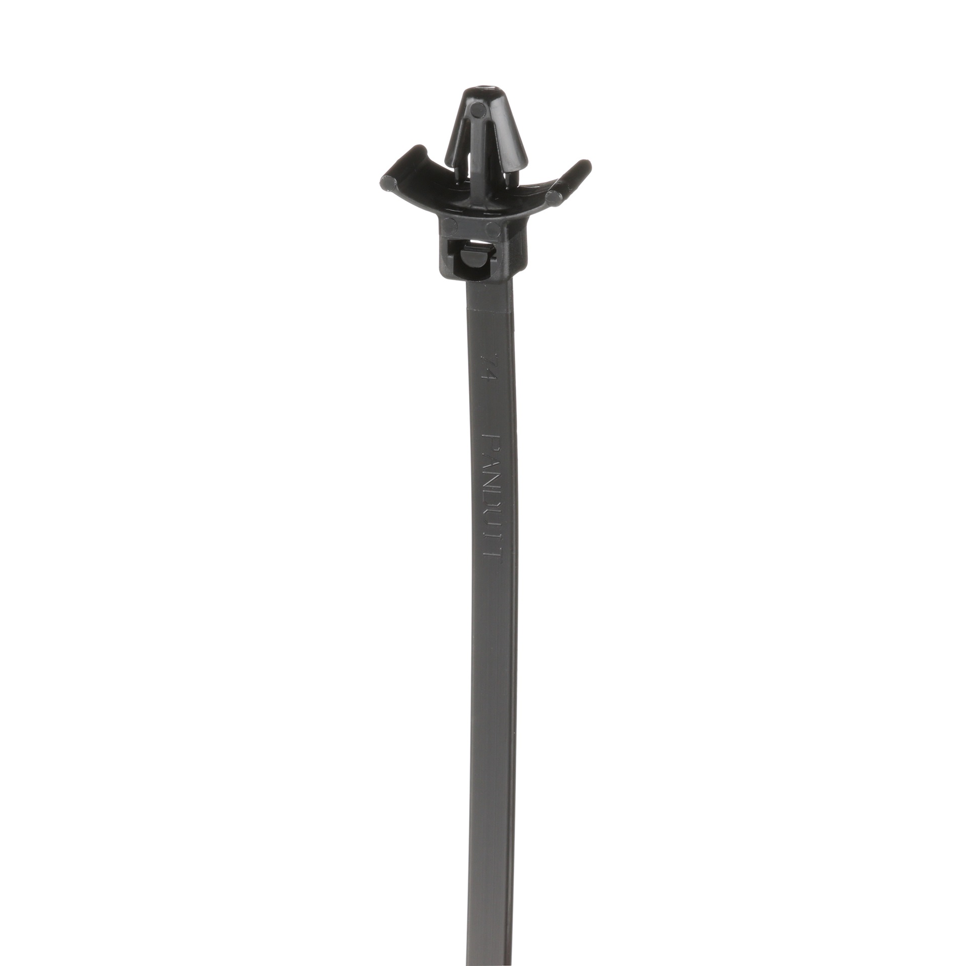 Wing Push Mount Tie, 7.8 Inches (198 mm) Length, Standard, Black. Weather Resistant for greater resistance to damage caused by ultraviolet light. Indoor or outdoor use. Cable tie, mount and fastener in a single part. Used to attach bundles to another surface such as a flat panel. Anchor is easily pressed into a pre-formed hole and locks in place. Wings provide constant tension for a stable, secure and rattle-free installation. Curved tip is easy to pick up from flat surfaces and allows faster initial threading.