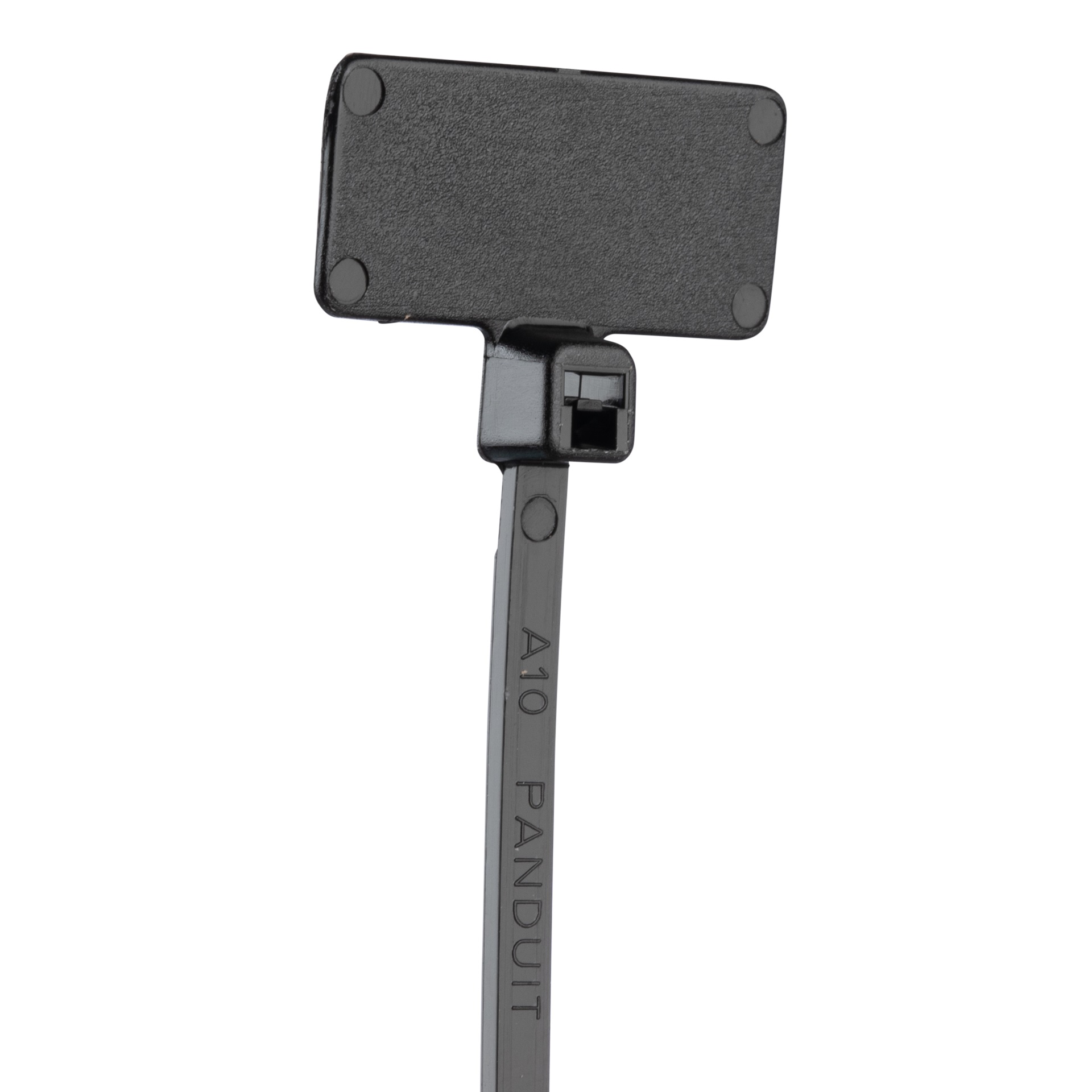 Marker Tie, Flag Style, 4.3 Inches (109 mm) Length, Miniature, Black. Weather Resistant for greater resistance to damage caused by ultraviolet light. Indoor or outdoor use. Used to fasten and identify bundles at the same time. One-piece construction for consistent performance and reliability. Curved tip is easy to pick up from flat surfaces and allows faster initial threading. Can be used with Panduit permanent marker pens.
