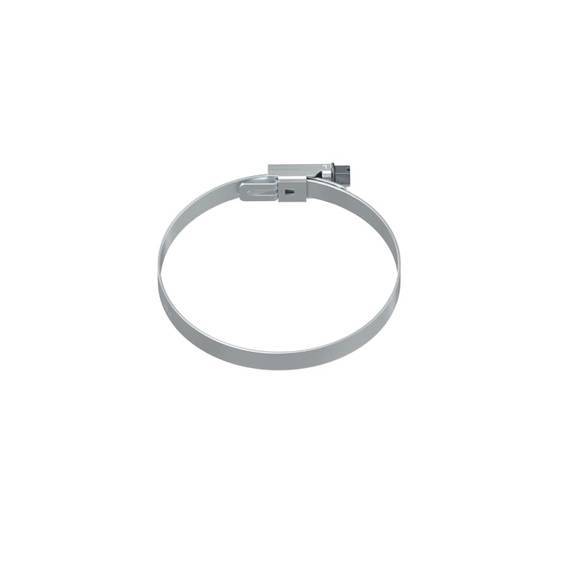 Fascetta stringitubo con dispositivo monoblocco a vite esagonale. Cremagliera esterna, interno liscio con bordi laterali rialzati.