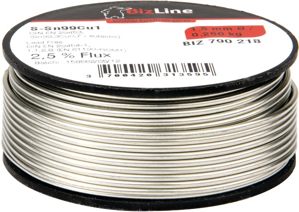 Filo per saldatura 250 g Ø 1,5 mm in Sn (stagno) al 99,3% e Cu (rame) allo 0,7%.