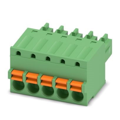 Connettore per circuiti stampati, sezione nominale: 1,5 mm², colore: verde, corrente nominale: 8 A, tensione di dimensionamento (III/2): 160 V, superficie contatti: Sn, tipo di connessione del contatto: Femmina, numero dei potenziali: 5, numero di file: 1, numero poli: 5, numero di connessioni: 5, serie di prodotti: FK-MCP 1,5/..-ST, passo: 3,81 mm, tipo di connessione: Connessione a molla Push-in, direzione di collegamento conduttore/scheda: 0 °, sistema di spine: COMBICON MC 1,5, bloccaggio: assente, tipo di fissaggio: assente, tipo di confezione: confezionato nel cartone