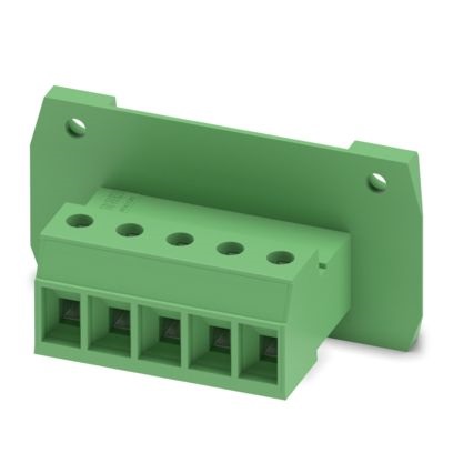 Connettore di passaggio, sezione nominale: 4 mm², colore: verde, corrente nominale: 20 A, tensione di dimensionamento (III/2): 630 V, superficie contatti: Sn, tipo di connessione del contatto: Spina, numero dei potenziali: 5, numero di file: 1, numero poli: 5, numero di connessioni: 5, serie di prodotti: DFK-PC 4/..-GF, passo: 7,62 mm, tipo di connessione: Connessione a vite con gabbia, forma di attacco delle viti: L Fessura longitudinale, montaggio: Montaggio diretto, direzione di collegamento conduttore/scheda: 0 °, numero di pin di saldatura per potenziale: 1, sistema di spine: COMBICON PC 4, Orientamento pin d'inserimento: Standard, bloccaggio: Bloccaggio a vite, tipo di fissaggio: Flangia filettata, tipo di confezione: confezionato nel cartone