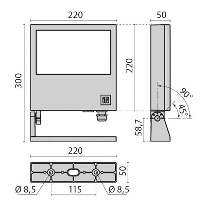 Proiettore LED per interni ed esterni, costituito da: Corpo e anello in alluminio pressofuso verniciato / Staffa di fissaggio, regolabile, in alluminio pressofuso verniciato / Diffusore in vetro piano extrachiaro temperato, serigrafato internamente / Ottica circolare / LED di alta potenza ad alto flusso luminoso di ultima generazione / Guarnizione in silicone / Viti di chiusura in acciaio inox / Pressacavo M20x1.5 per cavi Ø 7 - Ø 12 mm
