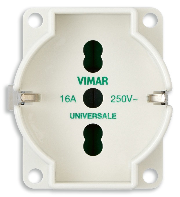 Frutto presa SICURY 2P+T 16 A 250 V~ universale, per applicazioni, avorio - per eurospine 2P 2,5 A, spine 2P e 2P+T 10 A e 16 A standard italiano e spine 2P+T 16 A standard tedesco - esecuzione monoblocco