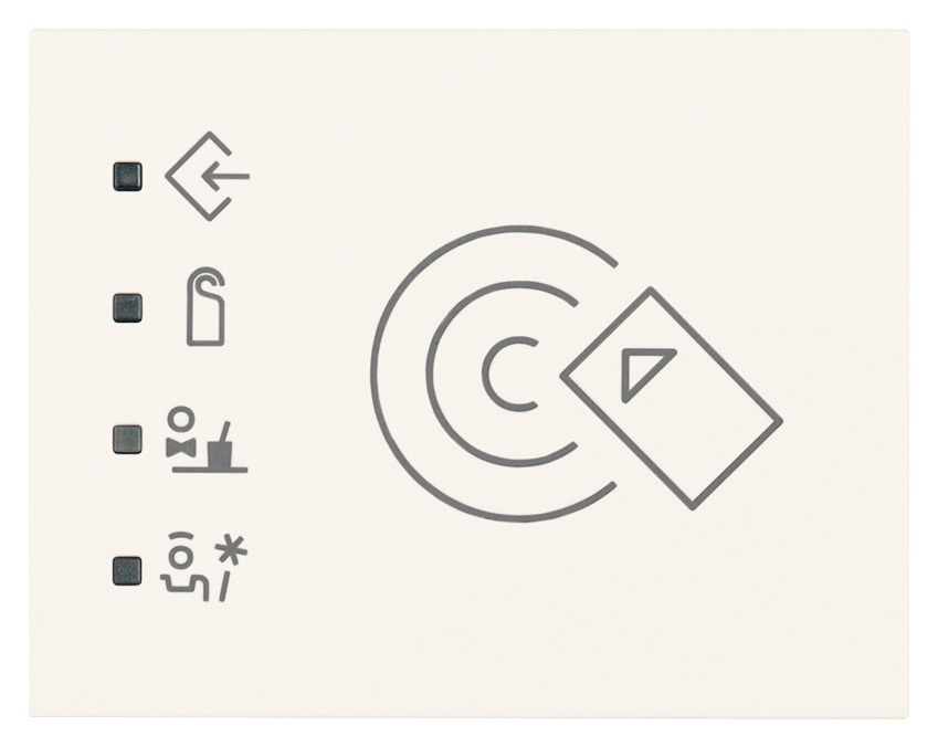 Lettore di carte a transponder tropicalizzato per installazione all'esterno della stanza, standard KNX, 2 uscite a relè NO 4 A 24 V~, 2 ingressi, alimentazione 12-24 V~ 50-60 Hz e 12-24 Vdc (SELV), bianco - 3 moduli. Per uso interno. Fornito senza carta a transponder