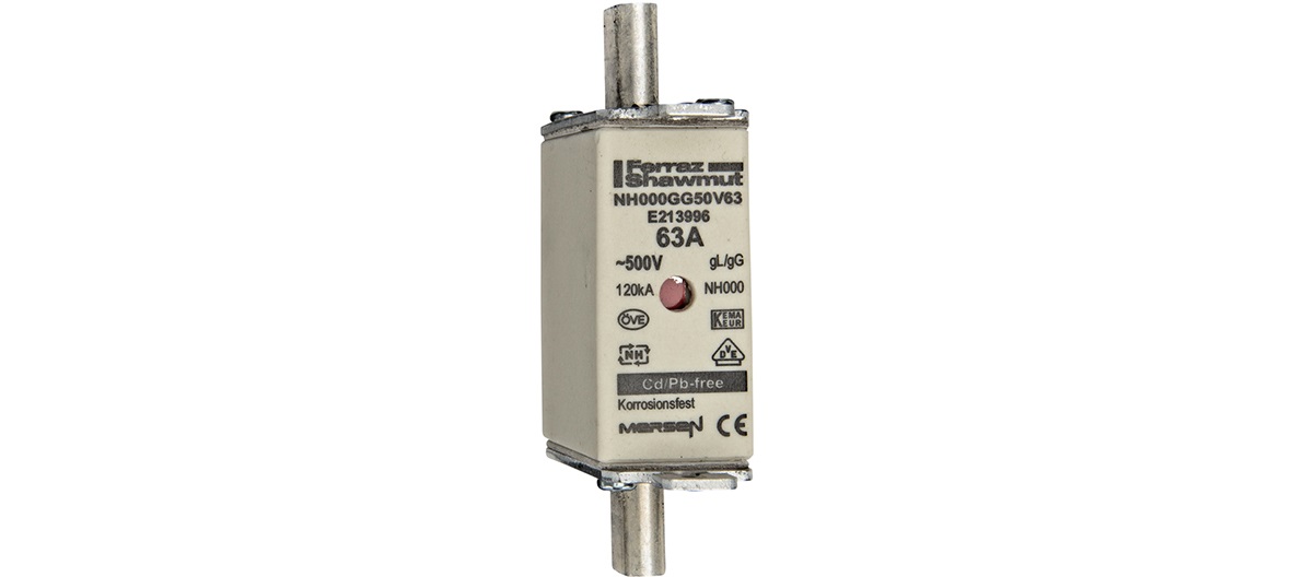 DIN NH Standard fuse-link gG Size NH000 500VAC 250VDC 63A live tags Double indicator Body width 21mm