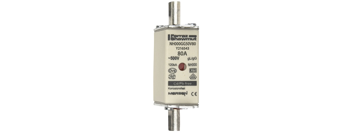 DIN NH Standard fuse-link gG Size NH000 500VAC 250VDC 80A live tags Double indicator Body width 21mm