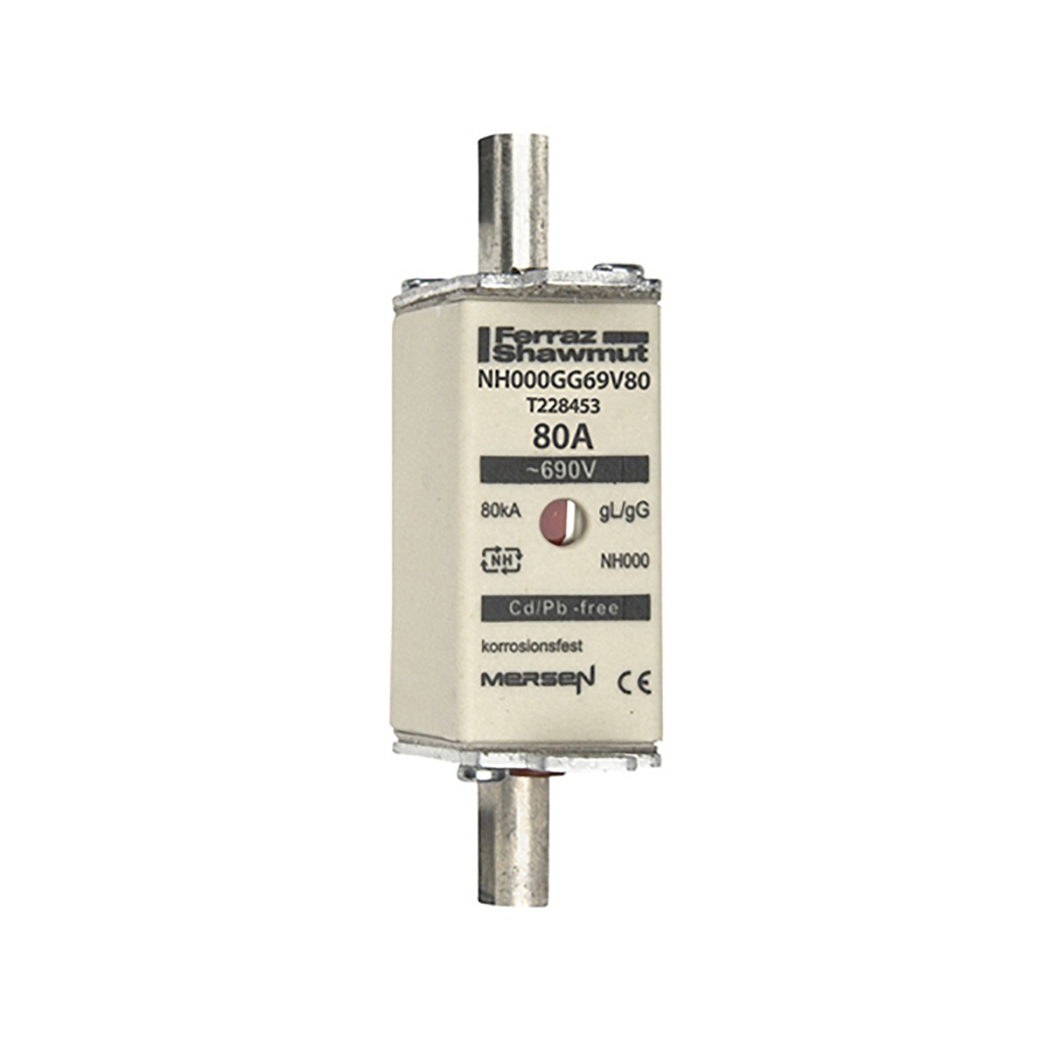 DIN NH Standard fuse-link gG Size NH000 690VAC 250VDC 80A live tags Double indicator Body width 21mm