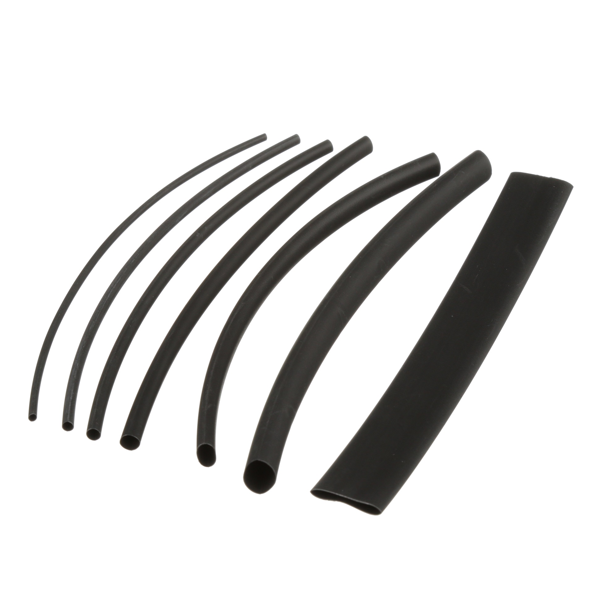 DRY-SHRINK Thin Wall Heat Shrink, 2 Pieces Each 0.06 Inch - 0.50 Inch (1.5 mm - 12.7 mm), 6 Inch (152.4 mm) Lengths, Black cross-linked Polyolefin Heat Shrink. Small package fits easily in tool box, Shrink ratio of 2 to 1 insulates a wide range of diameters and irregular shapes. Cross-linked, ultraviolet resistant material improves flame retardancy, chemical, and temperature resistance. Voltage is 600 Volts. UL Recognized. CSA Certified. Military Specification is AMS-DTL-23053/5 Class 1 (material performance only).