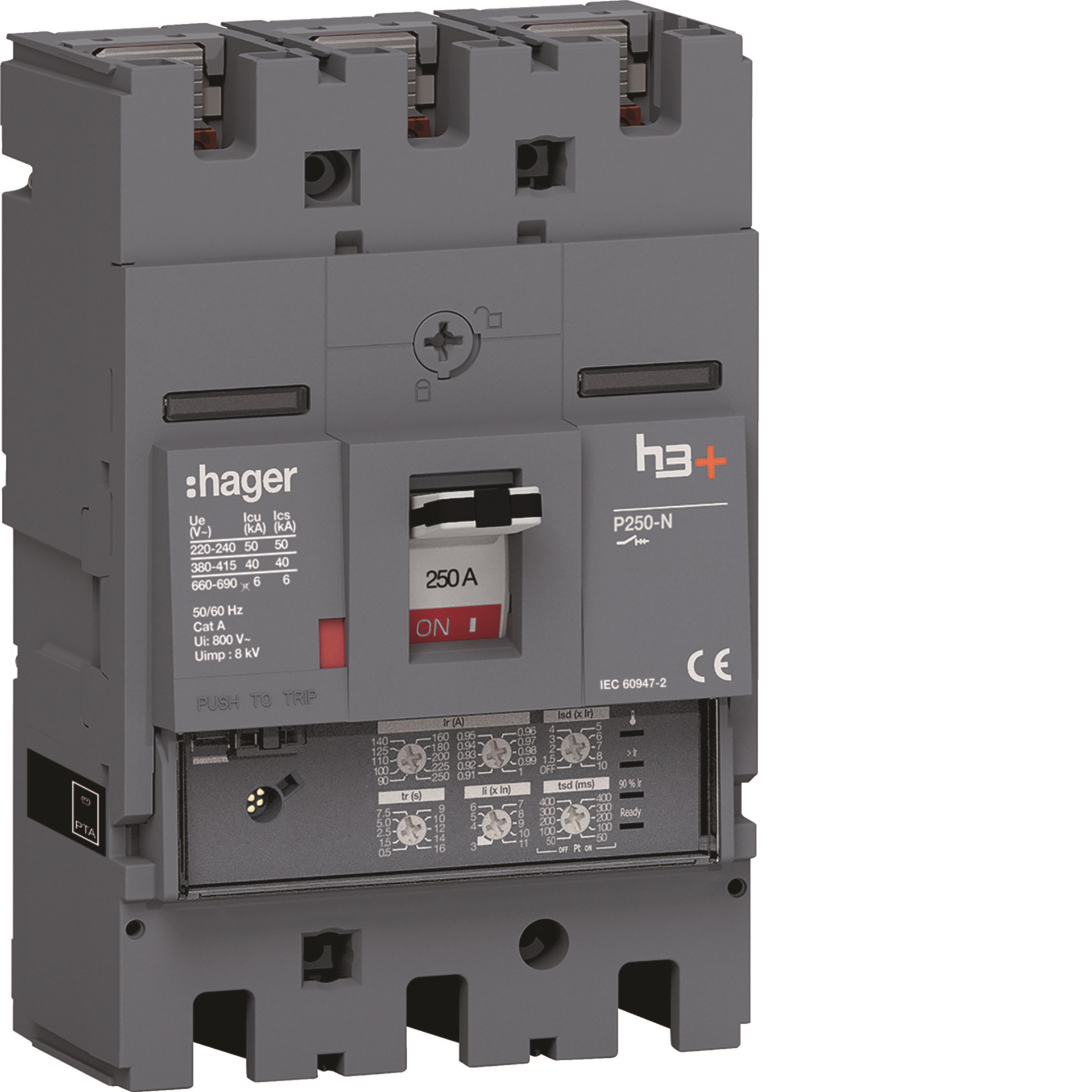 Interruttore automatico scatolato h3+ serie P250, versione fissa a 3 poli con terminali frontali. Progettato per impianti industriali e del terziario, assicura protezione da sovraccarichi e cortocircuiti. Equipaggiato con sganciatore LSI, ha una corrente nominale (In) di 250 A , tensione Ue di 690 V e potere di interruzione Icu pari a 40 kA, conforme alla norma CEI EN 60947-2.