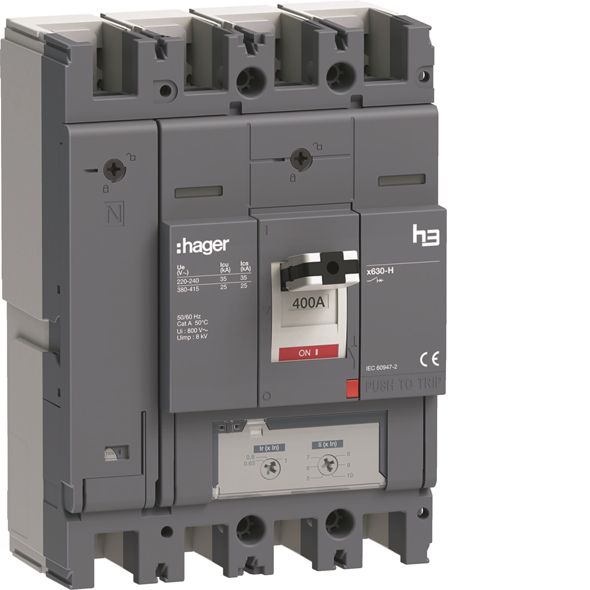 Interruttore automatico scatolato h3 serie x630, versione fissa a 4 poli con terminali frontali. Progettato per impianti industriali e del terziario, assicura protezione da sovraccarichi e cortocircuiti. Equipaggiato con sganciatore TM, ha una corrente nominale (In) di 400 A , tensione Ue di 415 V e potere di interruzione Icu pari a 25 kA, conforme alla norma CEI EN 60947-2.
