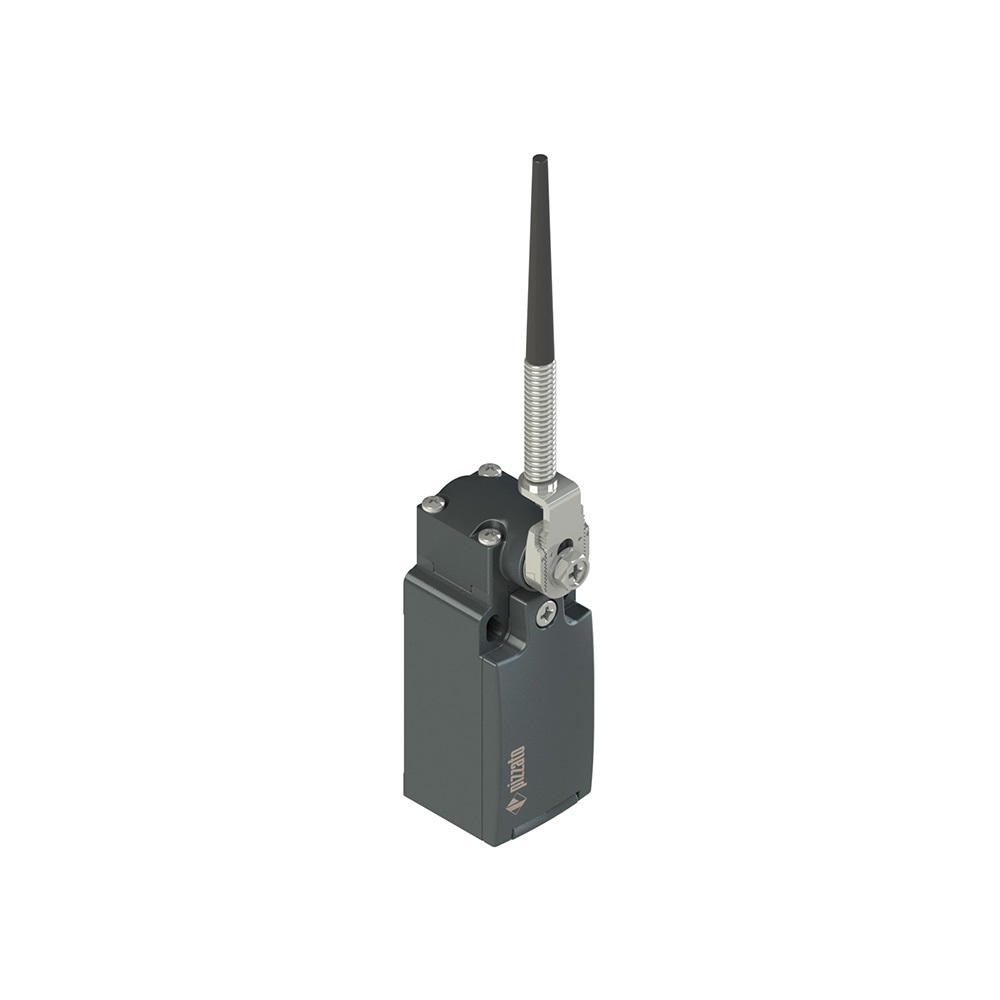 Interruttore di posizione a leva girevole con asta flessibile con puntale, Custodia: Custodia metallica, una entrata cavi filettata PG 13,5 (serie FM), Unit? di contatto: 1NO+1NC scatto rapido (B5), Testa: Per leve girevoli, Azionatore: A leva girevole con asta flessibile con puntale in plastica, Grado di protezione: IP67 secondo EN 60529.