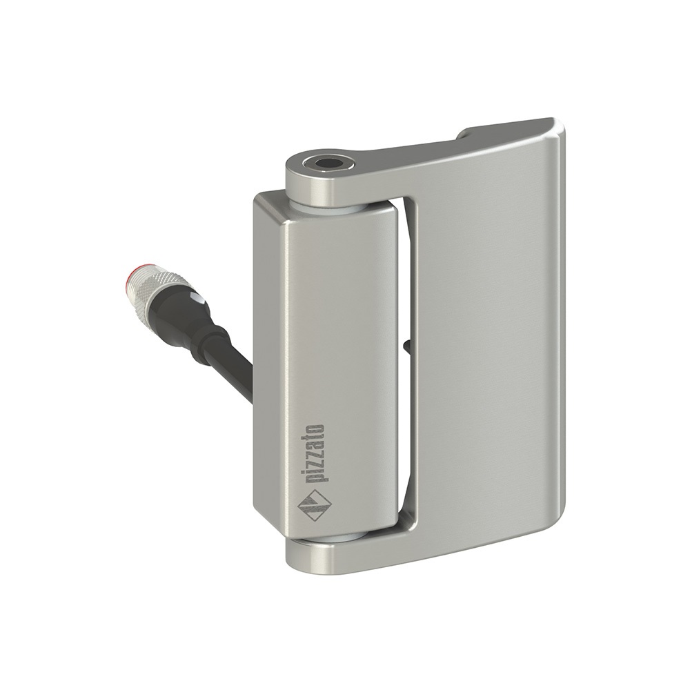 Interruttore di sicurezza a cerniera, Grado di protezione: IP67 secondo EN 60529 e IP69K secondo ISO 20653, Custodia: Corpo in metallo, uscita cavo posteriore (parte mobile 100x75 mm), Tipo di cavo o connettore: Cavo in PVC e connettore M12 a 5 poli.