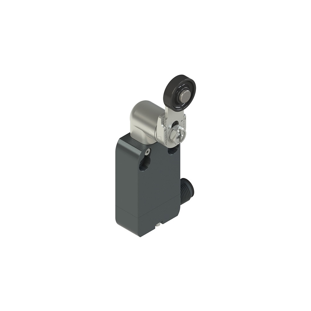 Interruttore precablato modulare a leva girevole in metallo diritta regolabile con rotella, Grado di protezione: IP67 secondo EN 60529 e IP69K secondo ISO 20653, Custodia: Custodia metallica, interasse fori di fissaggio 20 mm, Unit? di contatto: 1NO+1NC scatto rapido (B11), Testa: Testa in metallo per azionatori a leva girevole, Tipo di connessione: Connettore in metallo M12 da destra a 5 poli, Apertura positiva: S?.