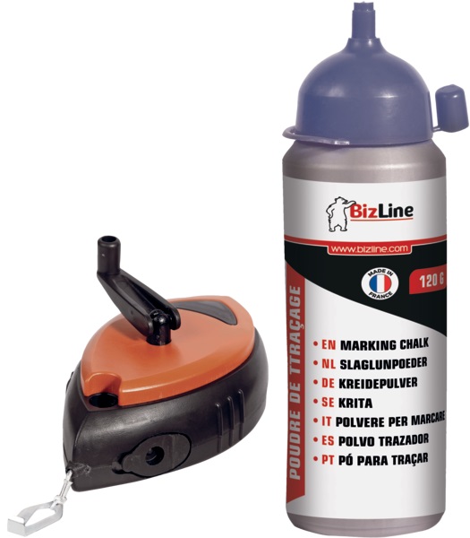 Kit composto da corda per marcatura e polvere da cantiere, blu, 120 g. Pratico: si riavvolge più rapidamente, 4/1, rispetto a una corda tradizionale. Possiede una manovella bloccabile/sbloccabile, basta quindi premere sul perno della manovella per sbloccare la corda.