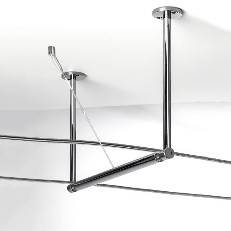 Sistema a tesata con coppia di cavi con interasse320mm: permette di installare apparecchi con fonte luminosa con LED integrato o con attacco tradizionale (GU10, R7s, E27 che consentono di montare lampadina LED). Corpi illuminanti in estruso di alluminio (verniciato bianco opaco o grigio opaco) e di ffusore in policarbonato. Disponibili in versioneluce diffusa, monoemissione o biemissione o a spot con corpo illuminante orientabile su due assi di ?35? rispetto all'asse verticale e di ?90? rispetto all'asse orizzontale. LED disponibile in due gr adazioni (3000K e 4000K).
